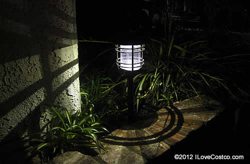 Inside the bucket, I put a solar-powered lawn light I bought at Costco. So the pumpkin lights up at dusk.